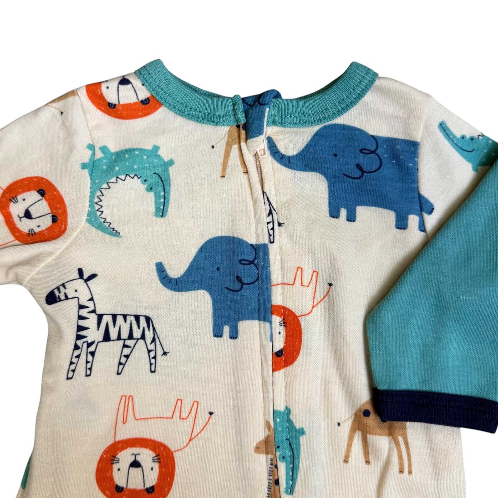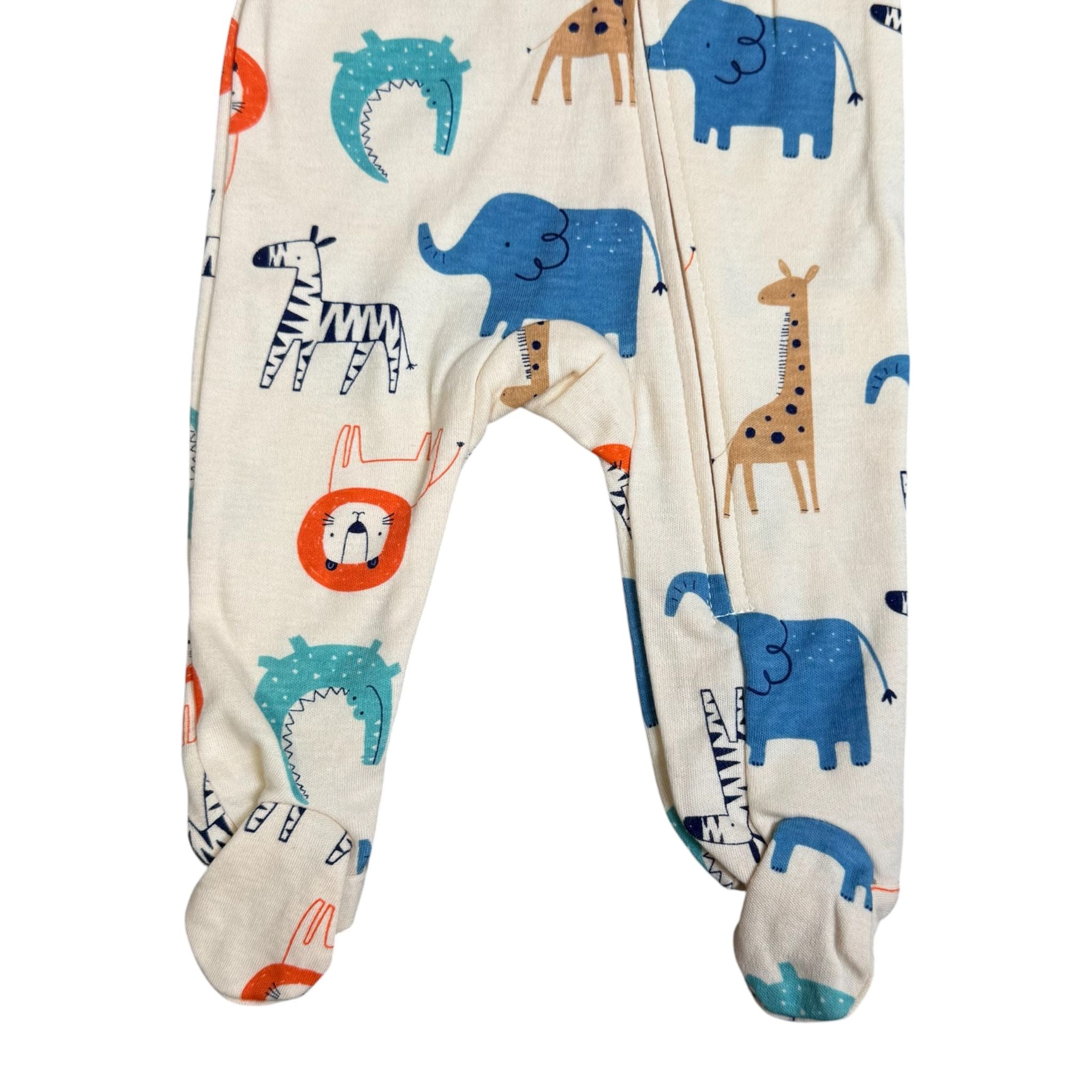 • Sleeper 1: Cream background with colorful all-over safari animal print (lions, elephants, giraffes, zebras, crocodiles). Full-length zipper with protective tab at neckline.