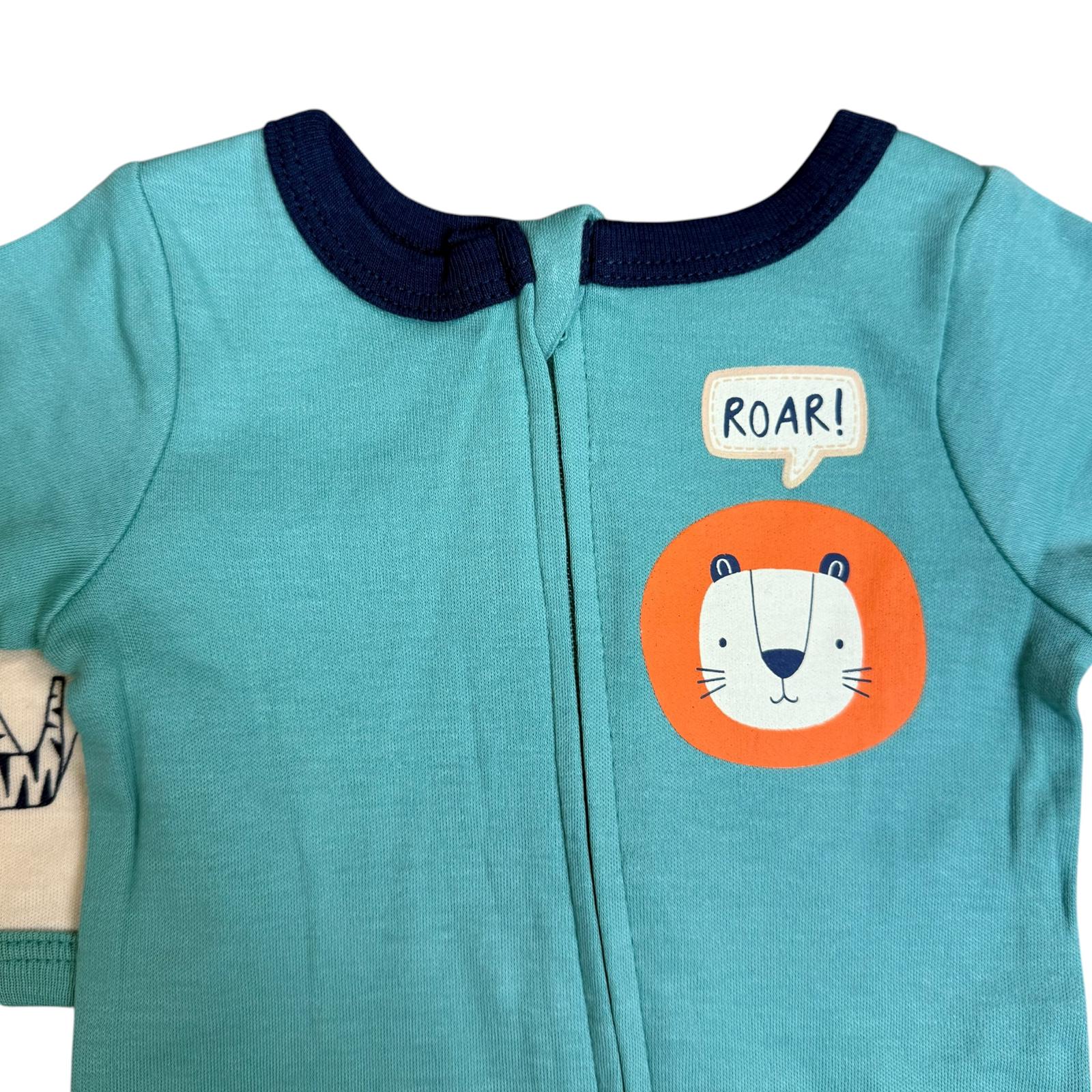 • Sleeper 2: Solid teal with navy trim, lion graphic and text โ€œROAR!โ€. Full-length zipper for easy dressing.