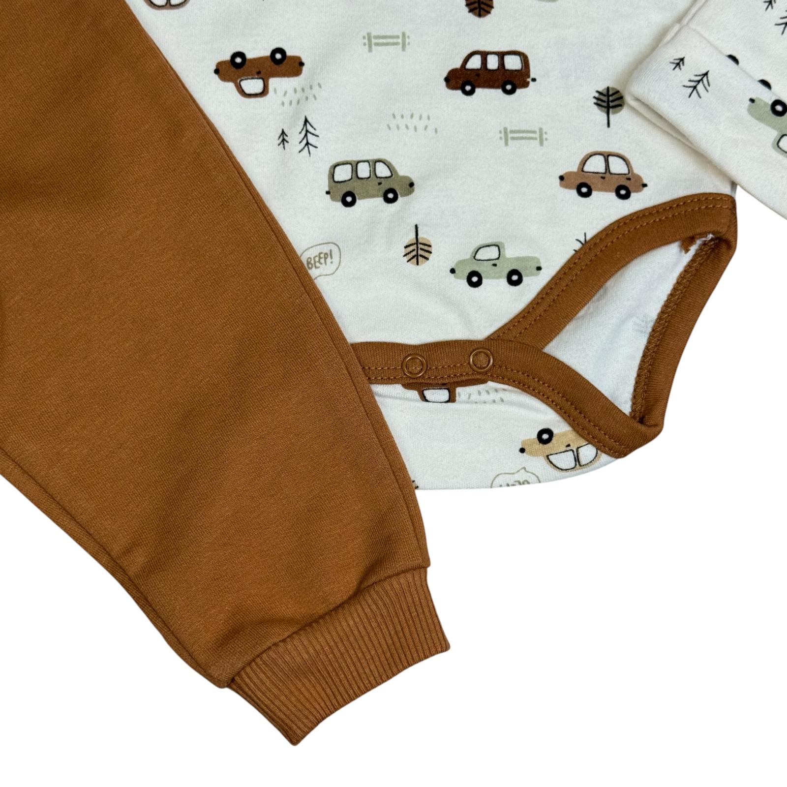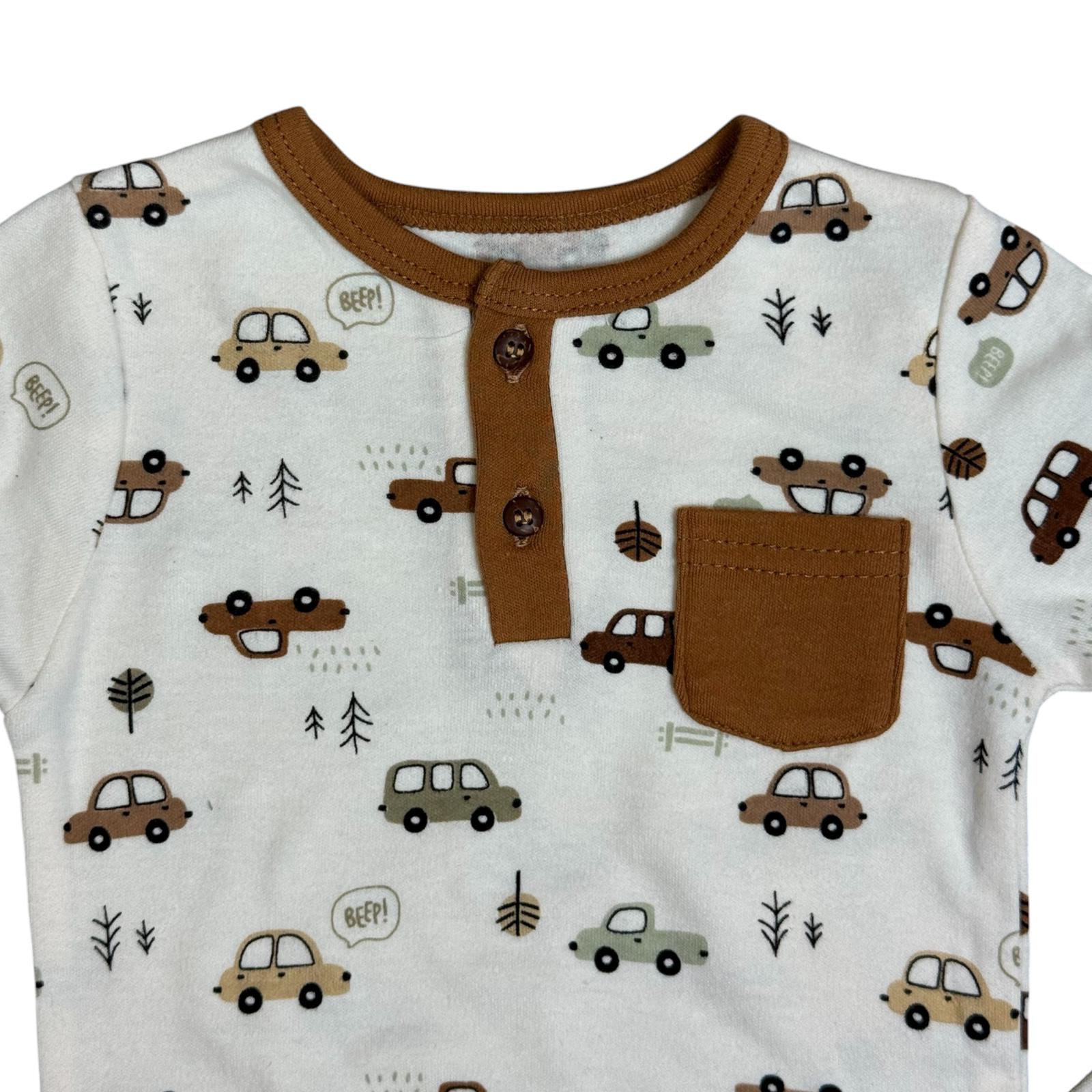 - Long Sleeve Bodysuit: White with all-over car print (brown, beige, green, and black), brown trim, functional buttons at the neckline, and a chest pocket.