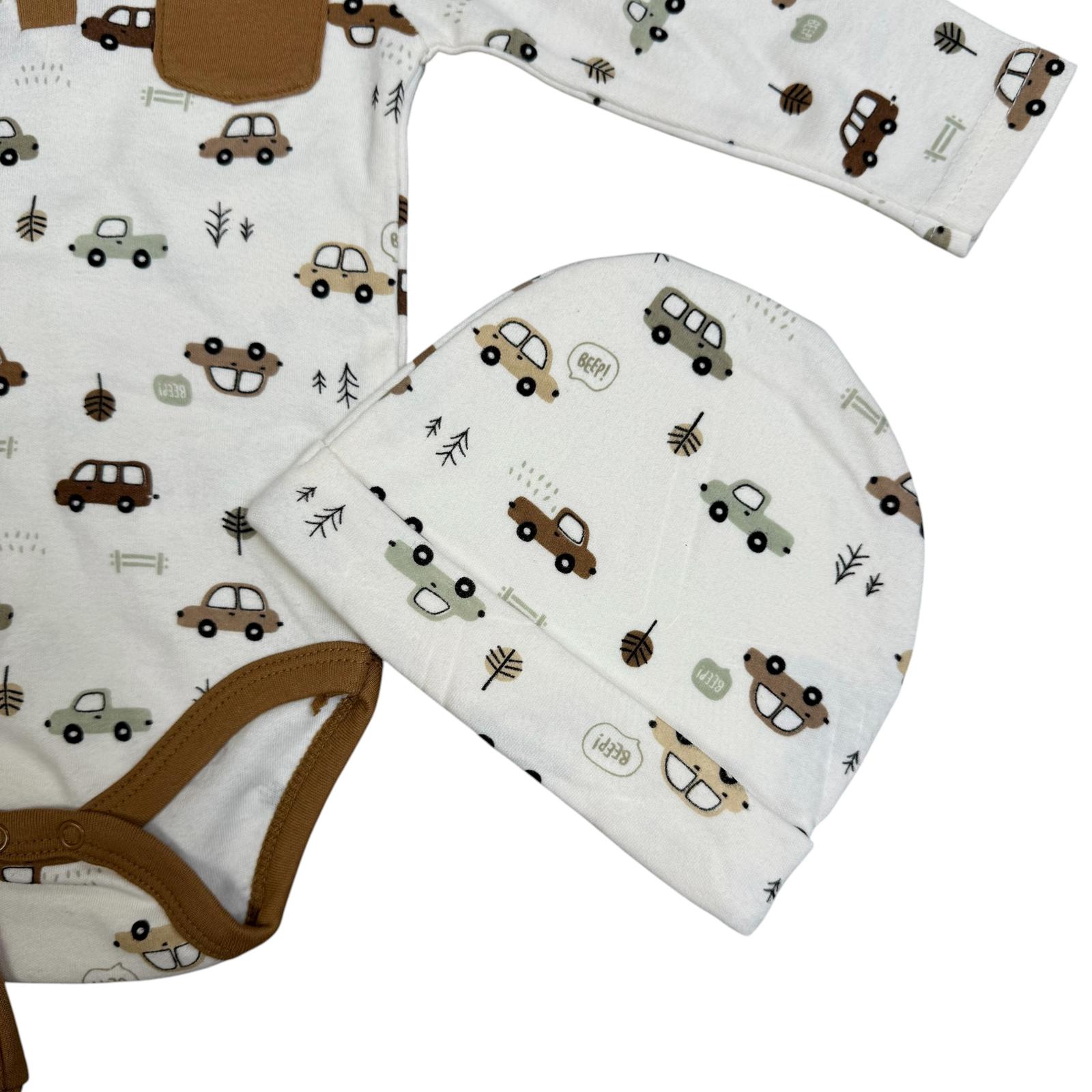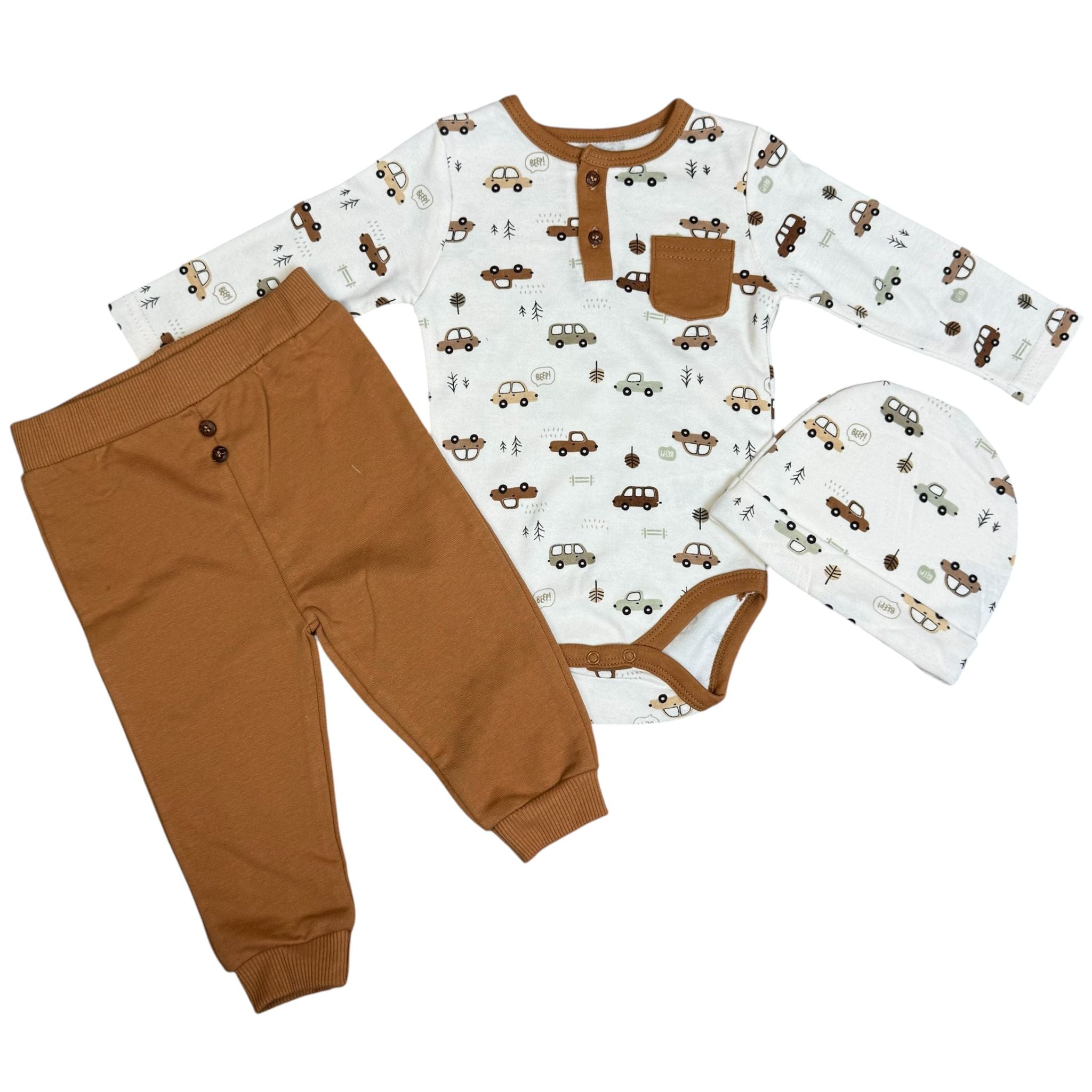 πΆ Baby Boys 3-Piece Outfit Set β Long Sleeve Bodysuit, Pants & Hat β Car Print ππ€
