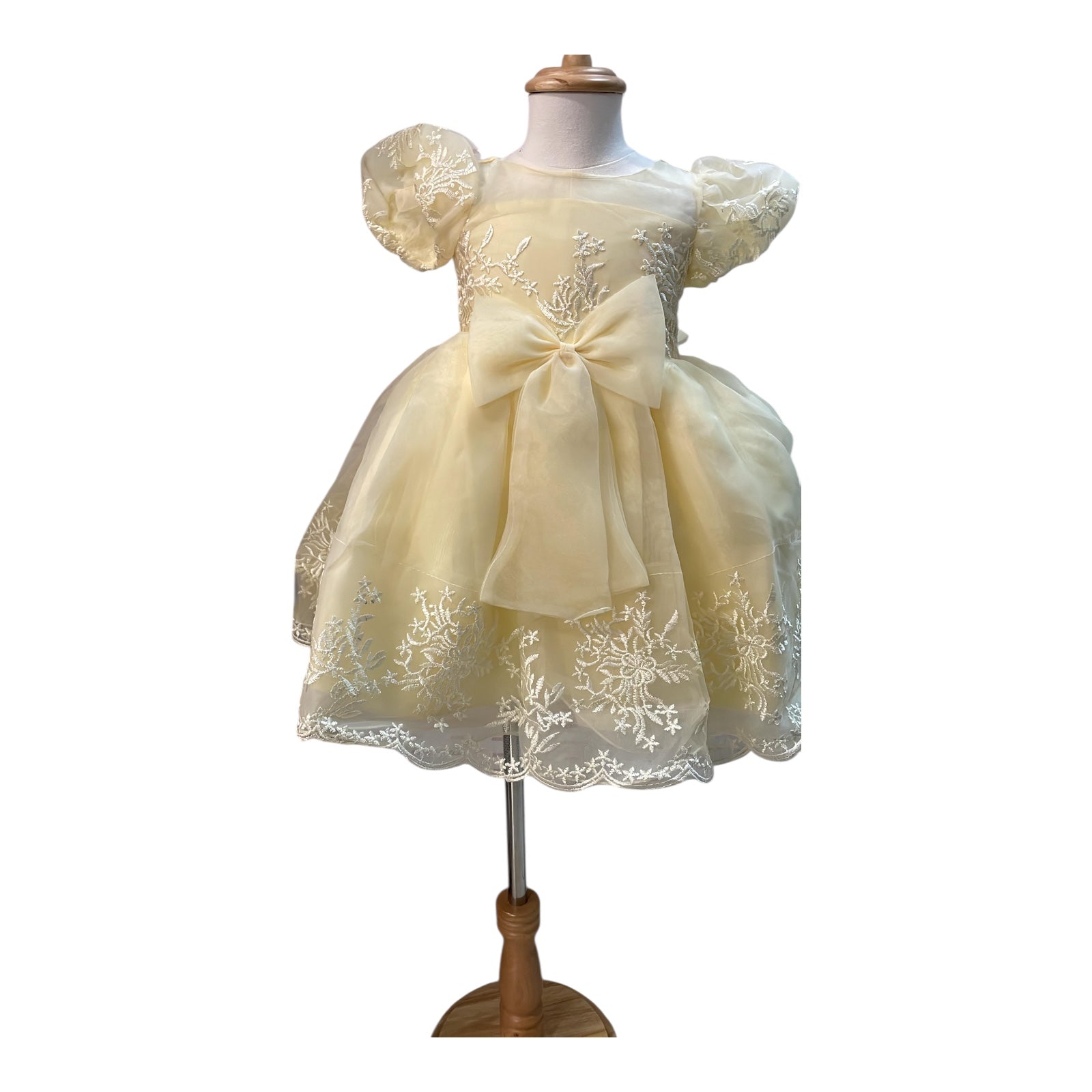 An enchanting dress for your little princess! Designed with elegant embroidered lace, puff sleeves, and a darling oversized bow, this gown is perfect for the most memorable celebrations. ✨