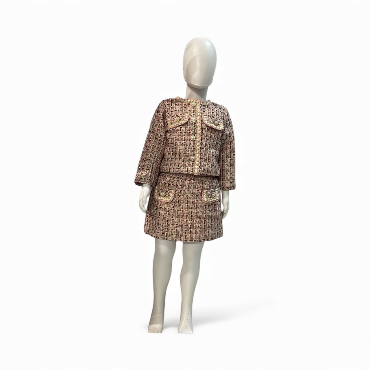 For little girls who love to dress with elegance! This gorgeous 2-piece tweed set delivers a premium boutique look with rich woven textures, pearl button accents, and glamorous pocket details. Perfect for stylish outings and special occasions. πŸ’–