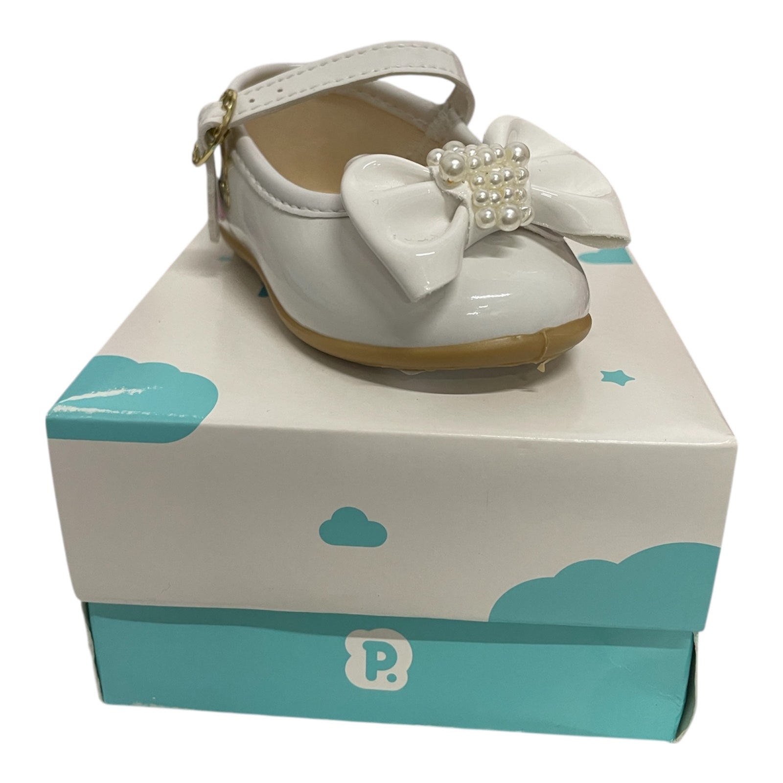 Baby Girl White Bow Shoes – Soft Sole with Pearl Detail (Pimpolho)