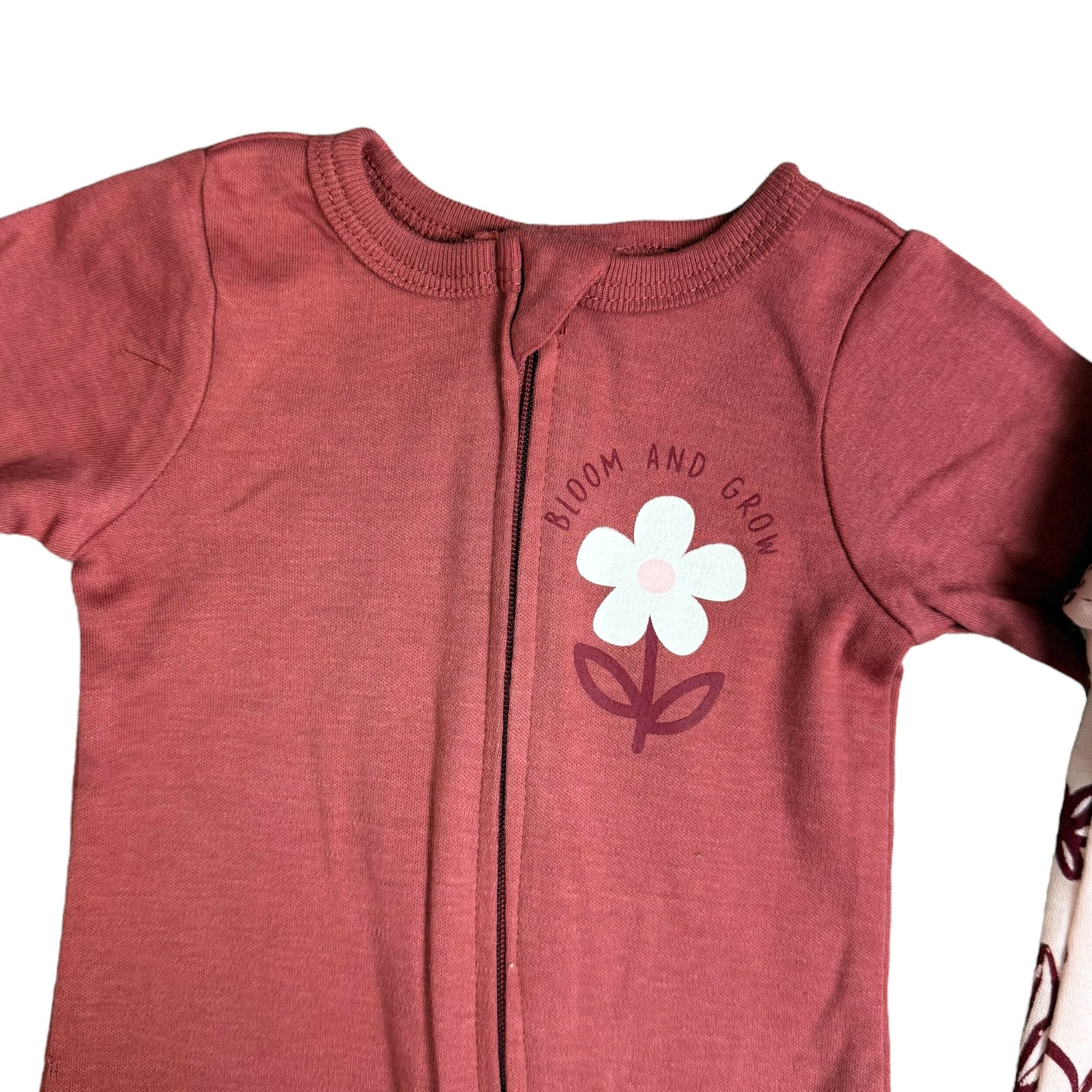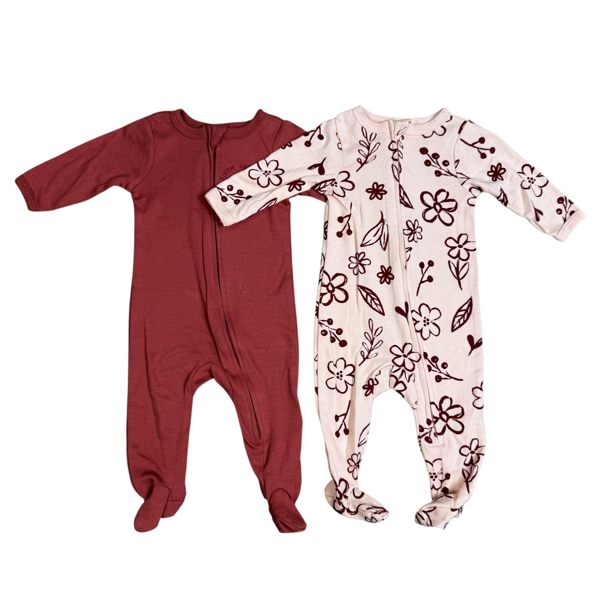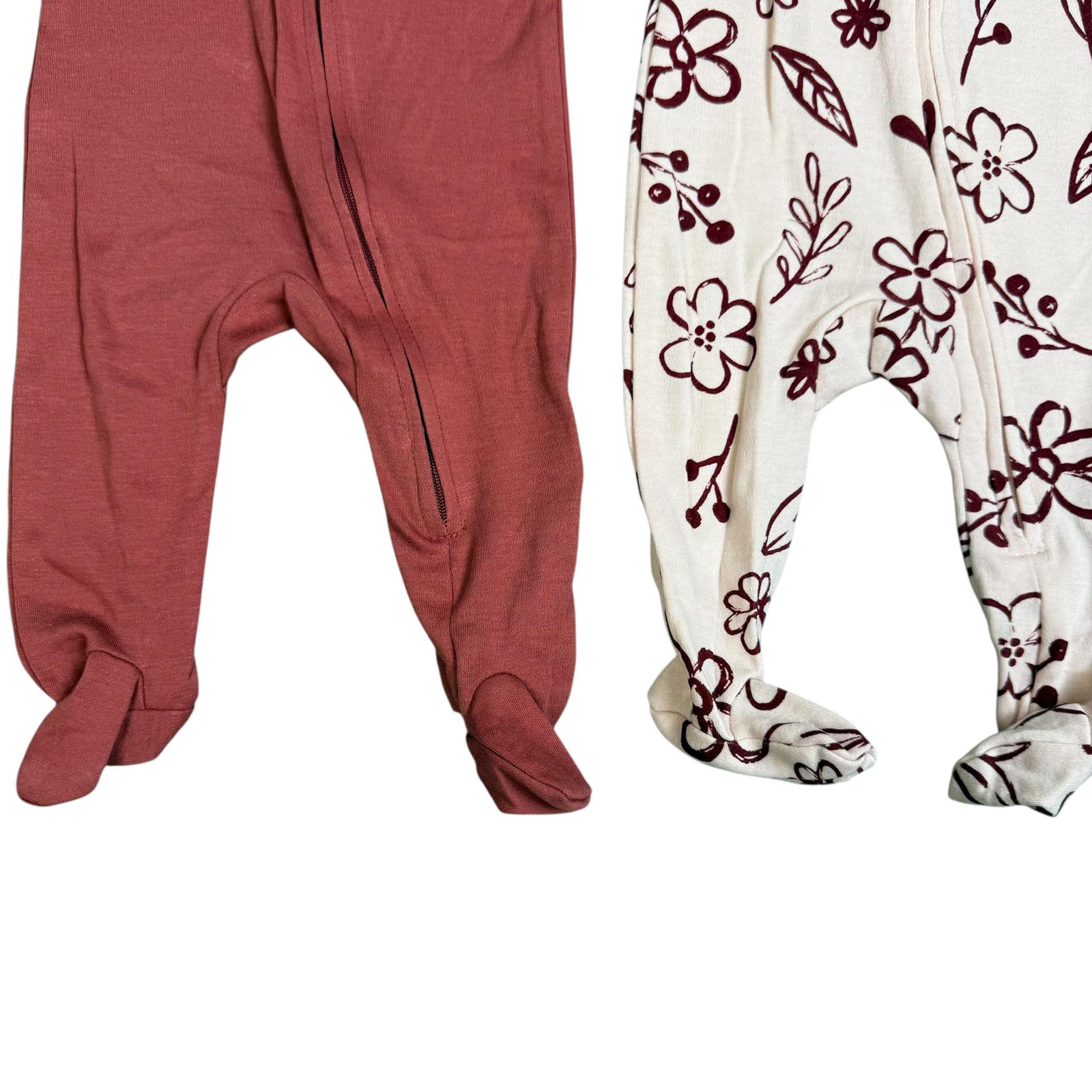- Designs: 1 floral print (cream background with burgundy flowers) + 1 solid rose sleeper with “Bloom and Grow” flower graphic