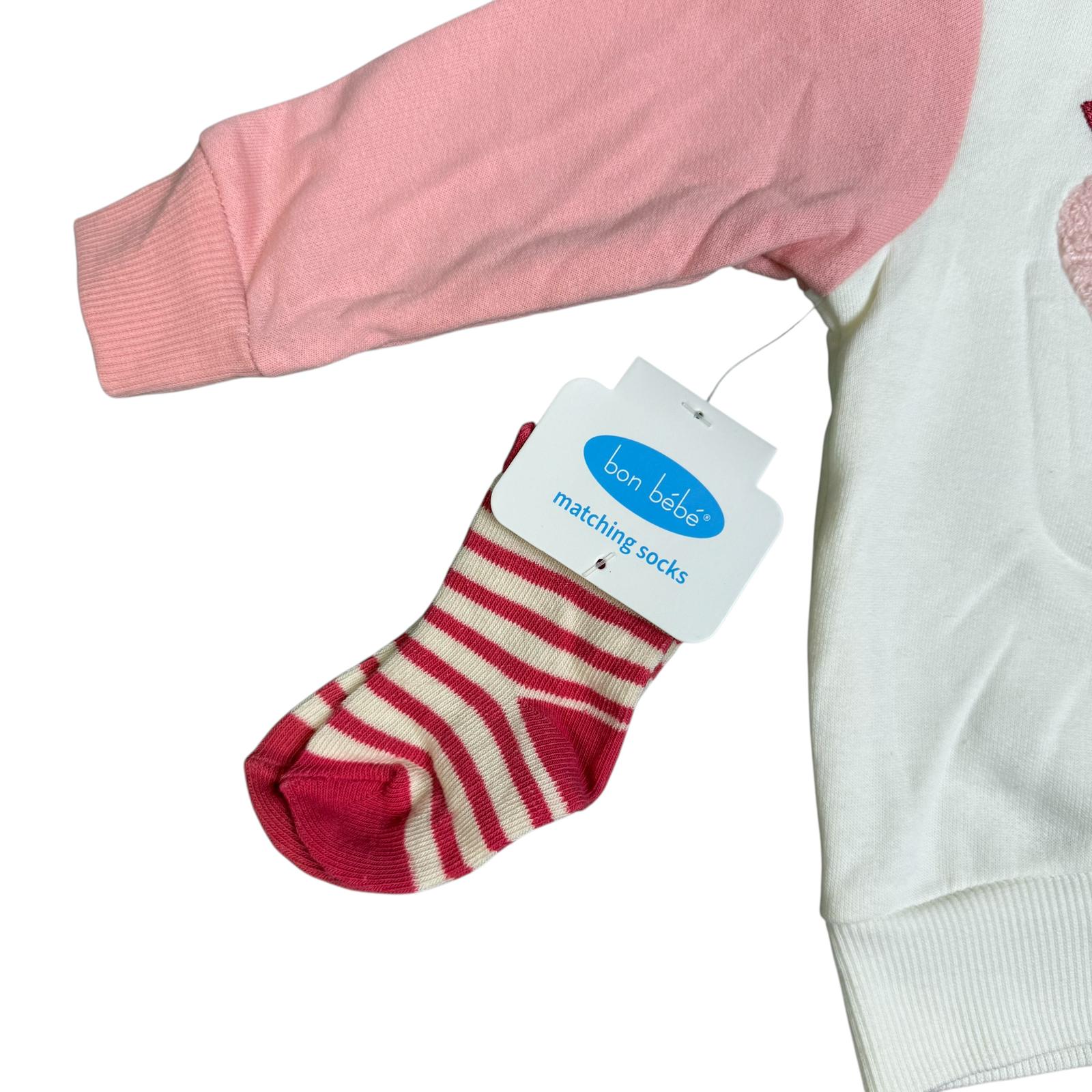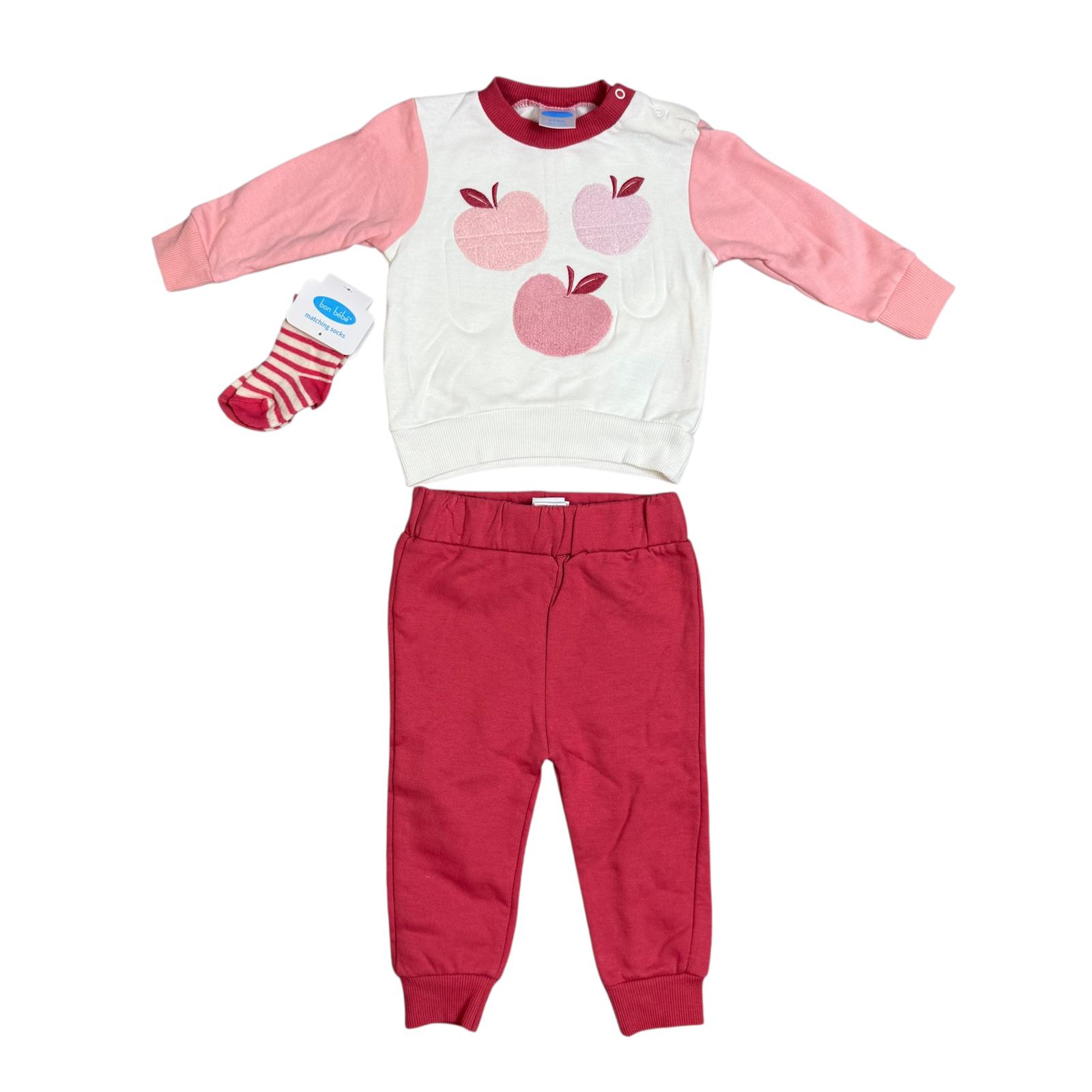 🍎 3-Piece Baby Girl Outfit Set – Apple Sweatshirt, Pants & Matching Socks – Soft Cotton