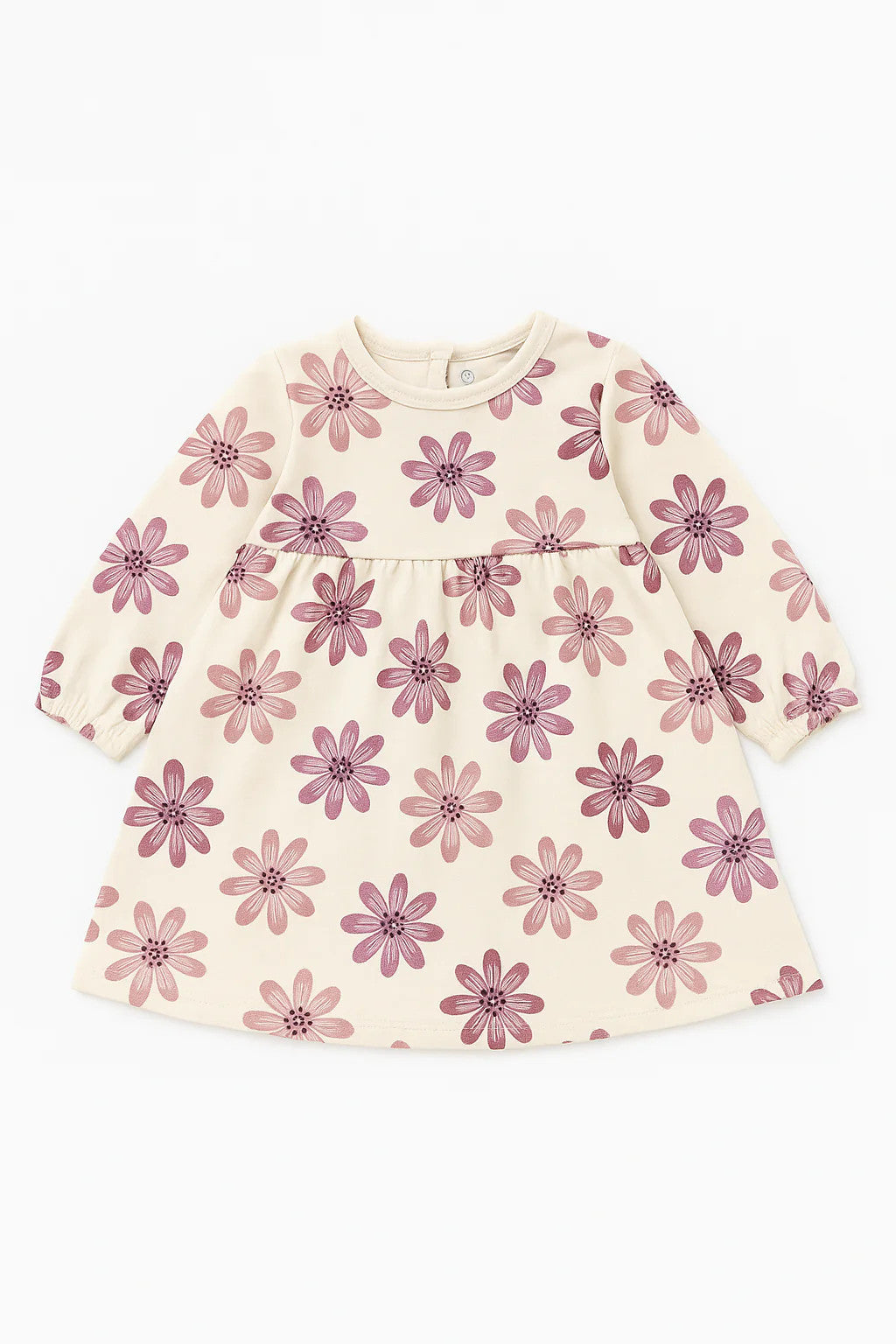 This set includes a soft long-sleeve dress with a charming pink daisy print, matching diaper cover, and a cute bow headband. Perfect for everyday wear, family photos, or special occasions.